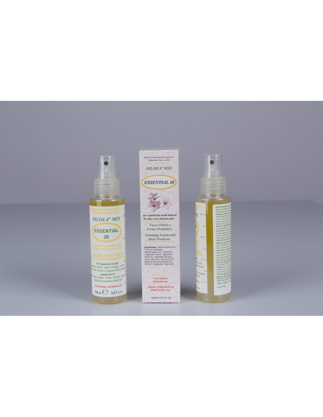 Oildea® Mix Essential 20, Tocco Finale e Termo Protettivo, Indicato in particolare per capelli sottili e molto delicati, è un olio vegetale con aggiunta di oli essenziali, di estratti, di cheratina, di vitamine e di essenze profumate, tutte completamente vegetali, realizzato con materie prime di altissima qualità, per ristrutturare, riparare, idratare, proteggere, lucidare e dare effetto seta.
