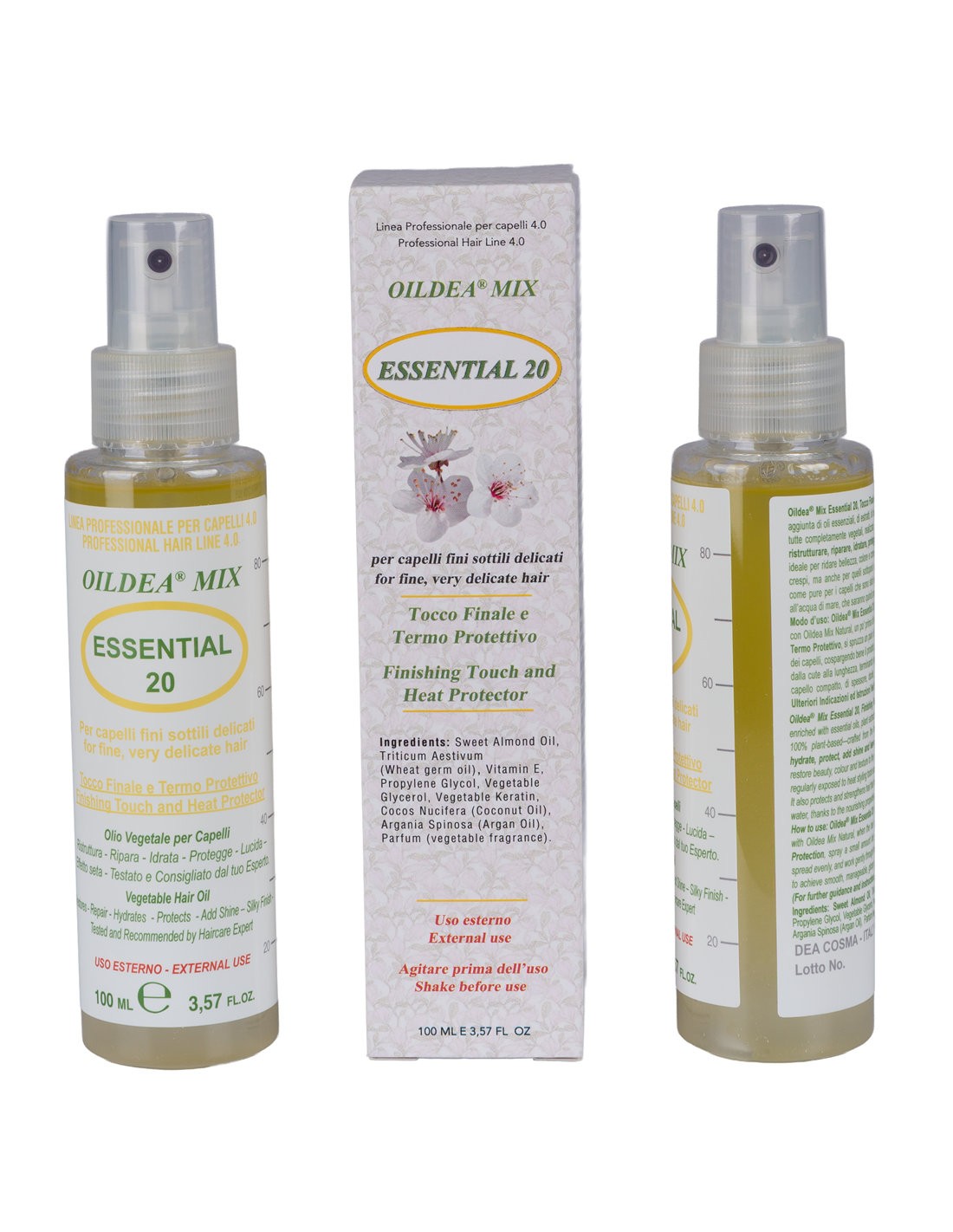 OILDEA® MIX ESSENTIAL 20 - Ingredients: Prunus Almygdalus ( Sweed Almond Oil), Triticum Aestivum ( Wheat germ oil), Vitamin E, Propylene Glycol, Vegetable Glycerol, Vegetable Keratin, Cocos Nucifera (Coconut Oil), Argania Spinosa (Argan Oil), Parfum (vegetable fragrance)