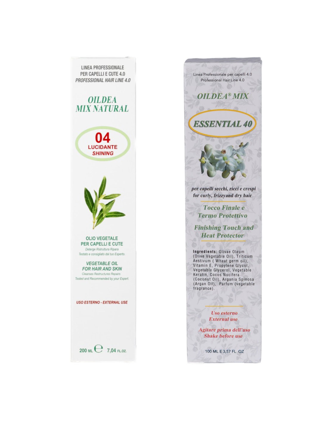 OILDEA® MIX ESSENTIAL 40 - Ingredients: Olivae Oleum ( Olive Vegetable Oil), Triticum Aestivum ( Wheat germ oil), Vitamin E, Propylene Glycol, Vegetable Glycerol, Vegetable Keratin, Cocos Nucifera (Coconut Oil), Argania Spinosa (Argan Oil), Parfum (vegetable fragrance)